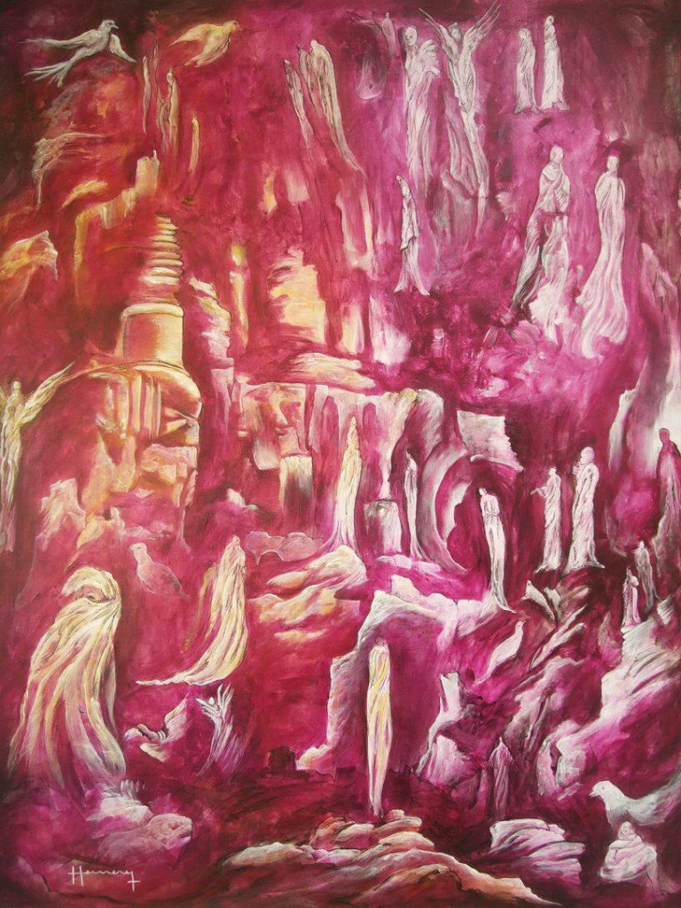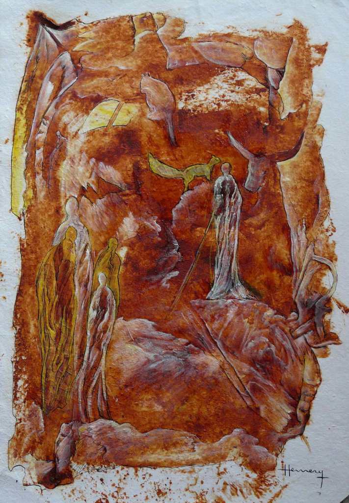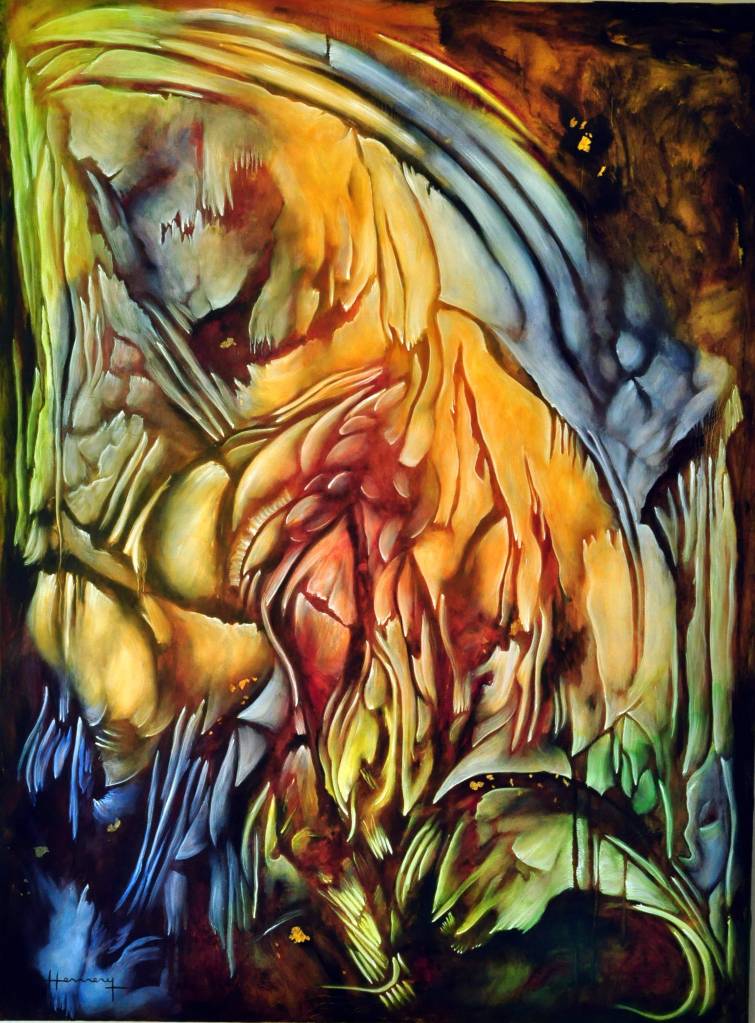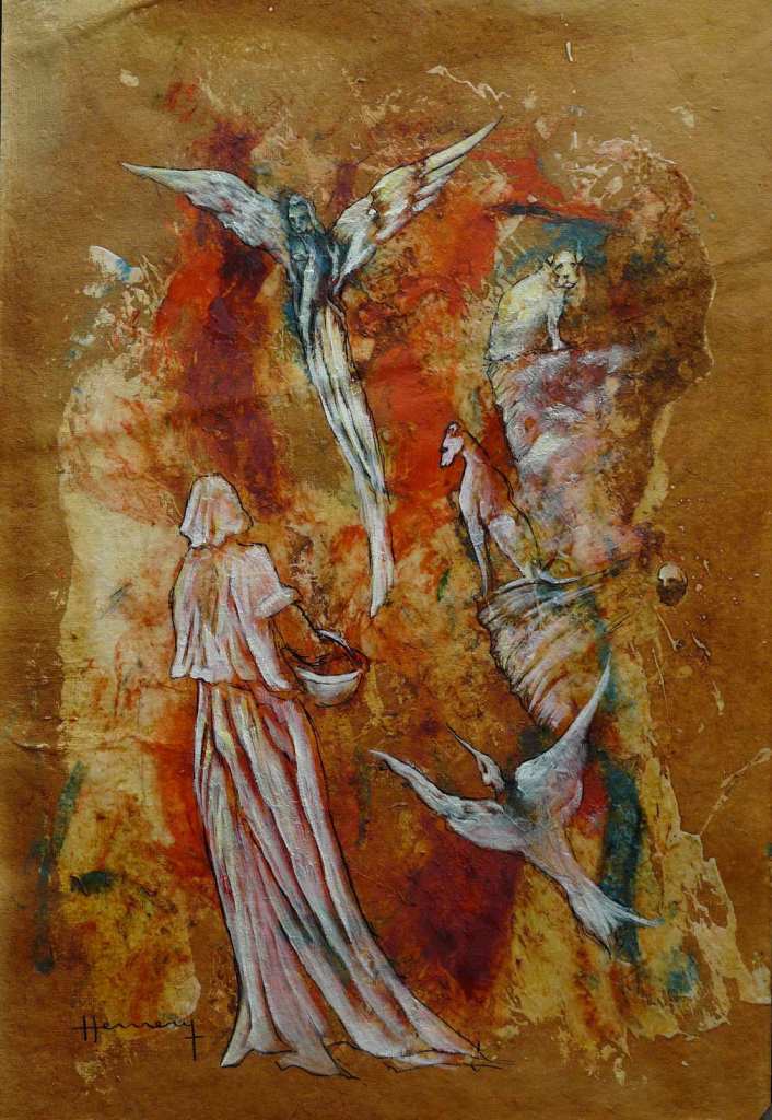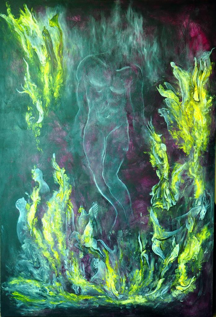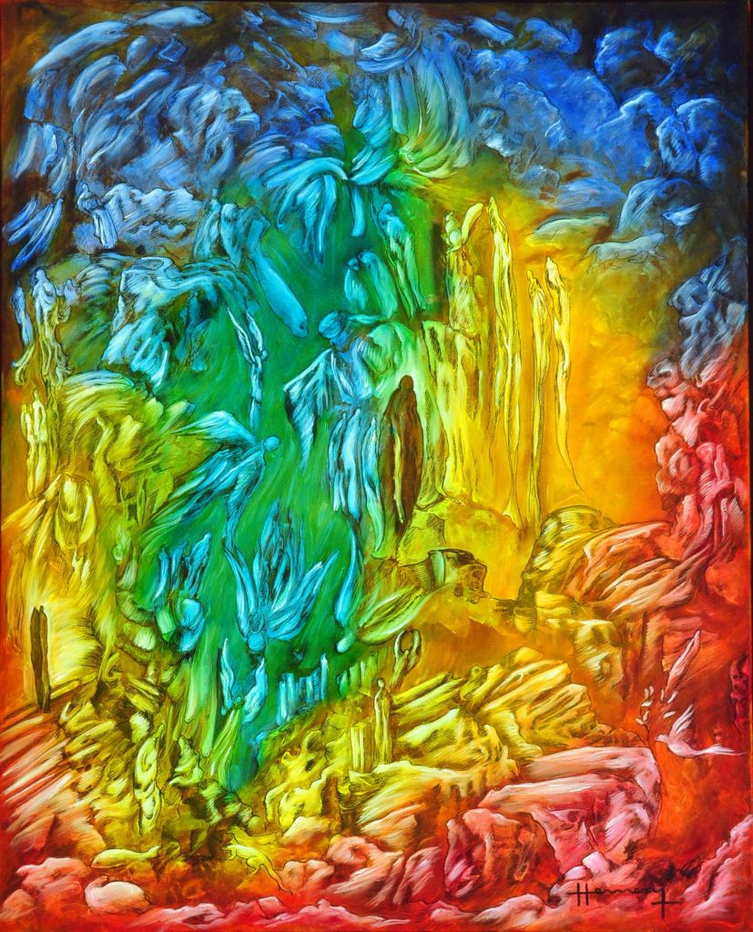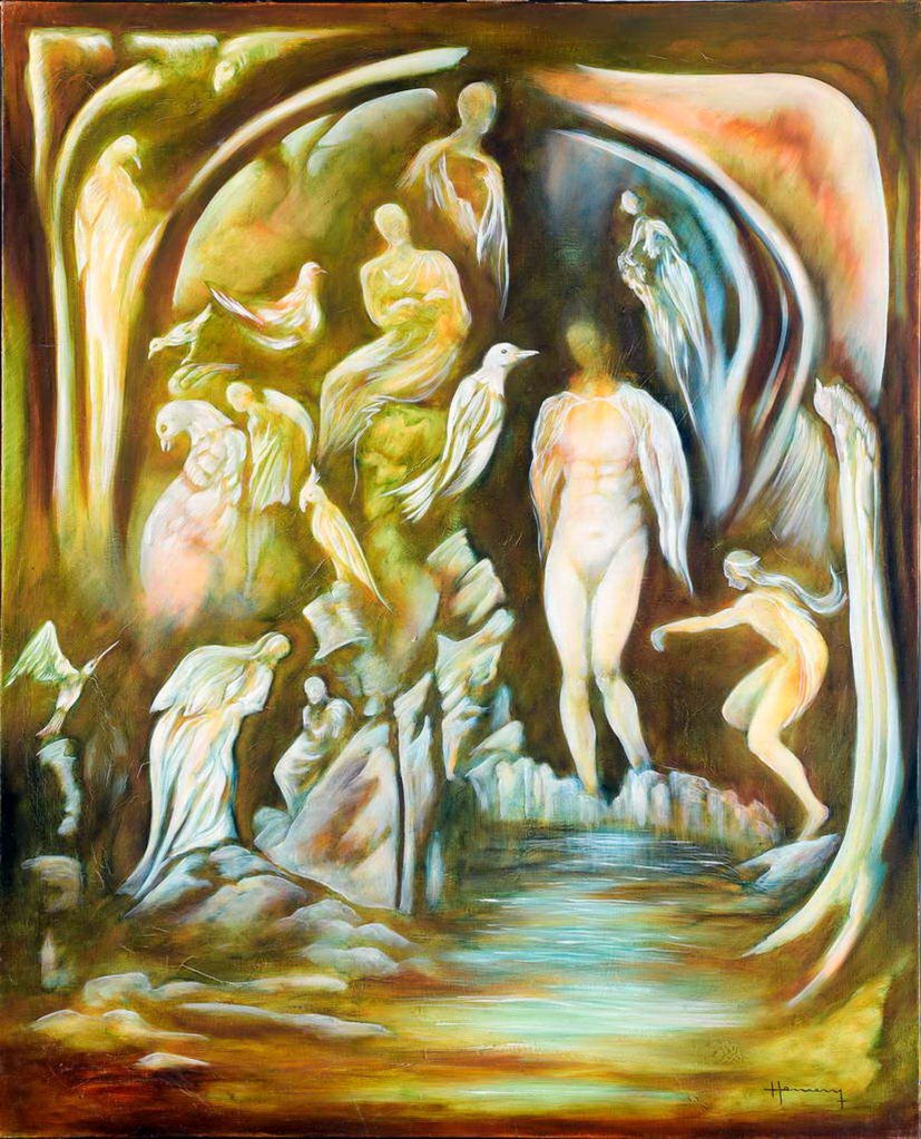 In a new impulse the artist starts representing a Pantheist visionary world opening our senses and our consciousness to the perception that « We are One with all the living creatures »